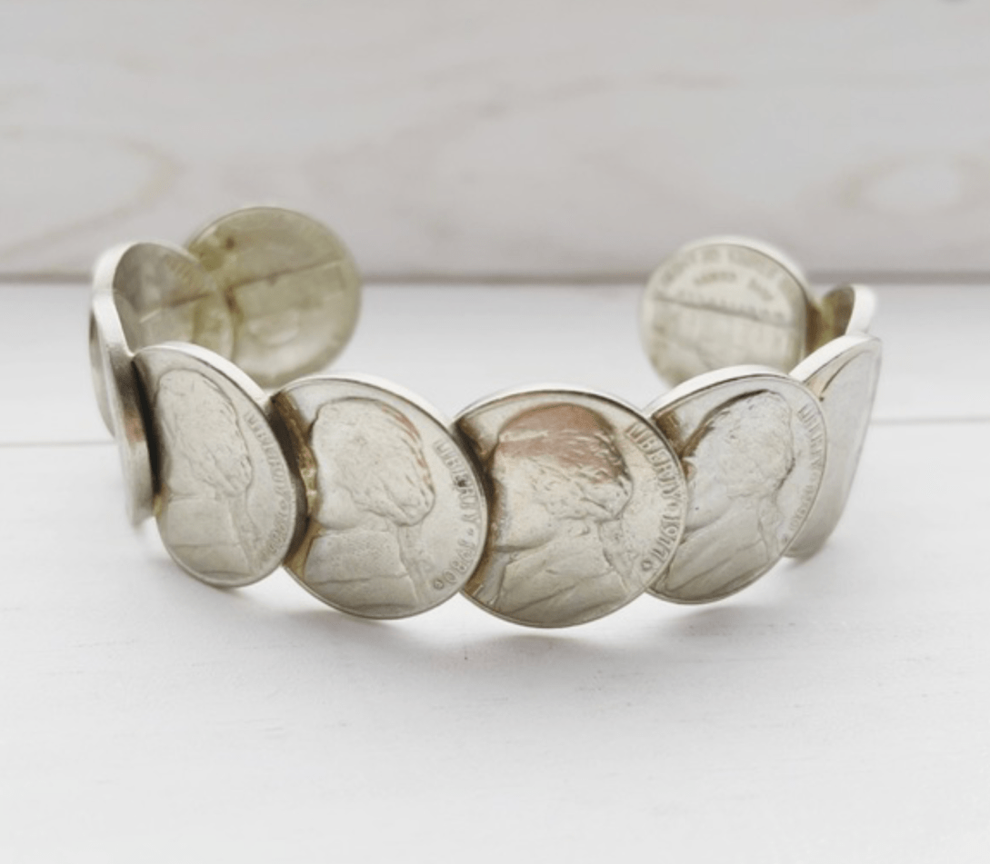 Journey through time with this vintage welded nickel bracelet, showcasing ten coins spanning from 1974 to 1992. Each nickel boasts its own unique story and character. Notably, this bracelet is non-flexible, offering a solid construction. It measures approximately 6.75″ in length with an opening of 1.25″, providing a total width of around 8″ in diameter.