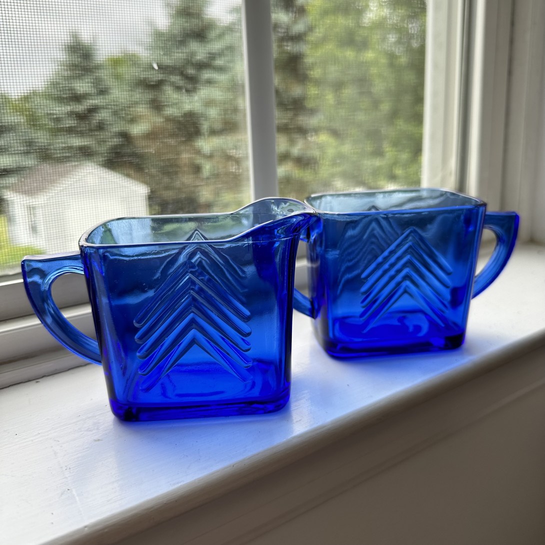 Add a touch of vintage charm to your collection with this stunning Hazel Atlas cobalt blue creamer and sugar pot set. Featuring a classic chevron design, these Depression Glass pieces are in fantastic vintage condition with no chips or cracks. Style them on a breakfast tray for a cozy morning, add elegance to your coffee station, or showcase them as a centerpiece on your dining table. Each measures approximately 3.5 inches by 4.5 inches. They will arrive expertly and carefully packaged for safety.