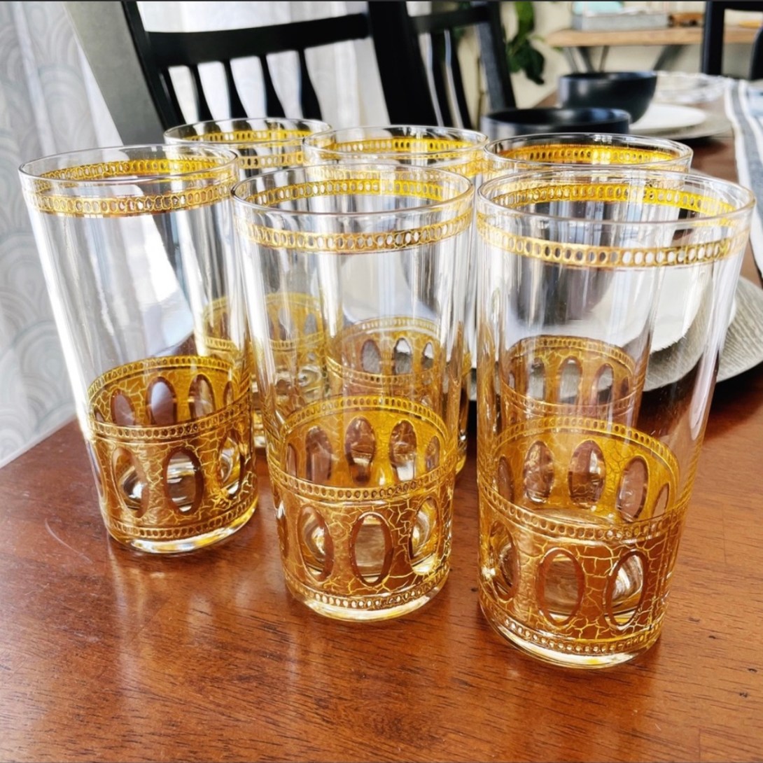 This set of 6 gorgeous vintage Collins glasses in “Antigua” design have a 22k gold crackle design with cutout ovals at the base and a gold band detail at the top.