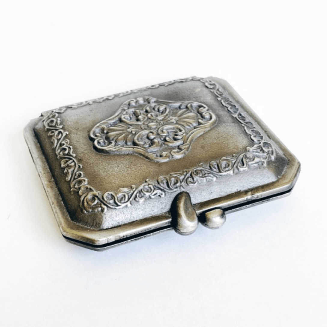accessories fashion new items Vintage Pewter Mirror + Photo compact Vintage mirrored compact case with photo compartment. Measures approximately 2.25” x 2.25” in great vintage condition, no cracks on mirror, some minor wear due to age. The stock photo included looks to be from the 1980’s. PURCHASE/INFO 1980's | coastal grandmother | compact | mirror | pewter | photo | vintage
