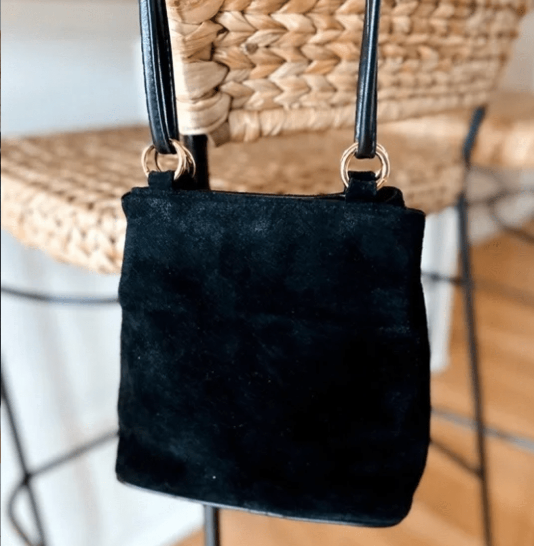 Casually chic, adorable Valerie Stevens small black suede purse. With its gold hardware and snap closure, it’s the perfect accessory to add a touch of elegance to any outfit. Measuring approximately 7 inches long and 6.5 inches wide, it’s just the right size to carry your essentials without weighing you down. The 14.5″ strap drop allows for comfortable shoulder wear. Crafted with excellent craftsmanship, this cute purse is a must-have for fashion-forward individuals who appreciate quality and style. Gently loved condition, smoke and pet free home. Please note this cutie is not long enough to use as crossbody.