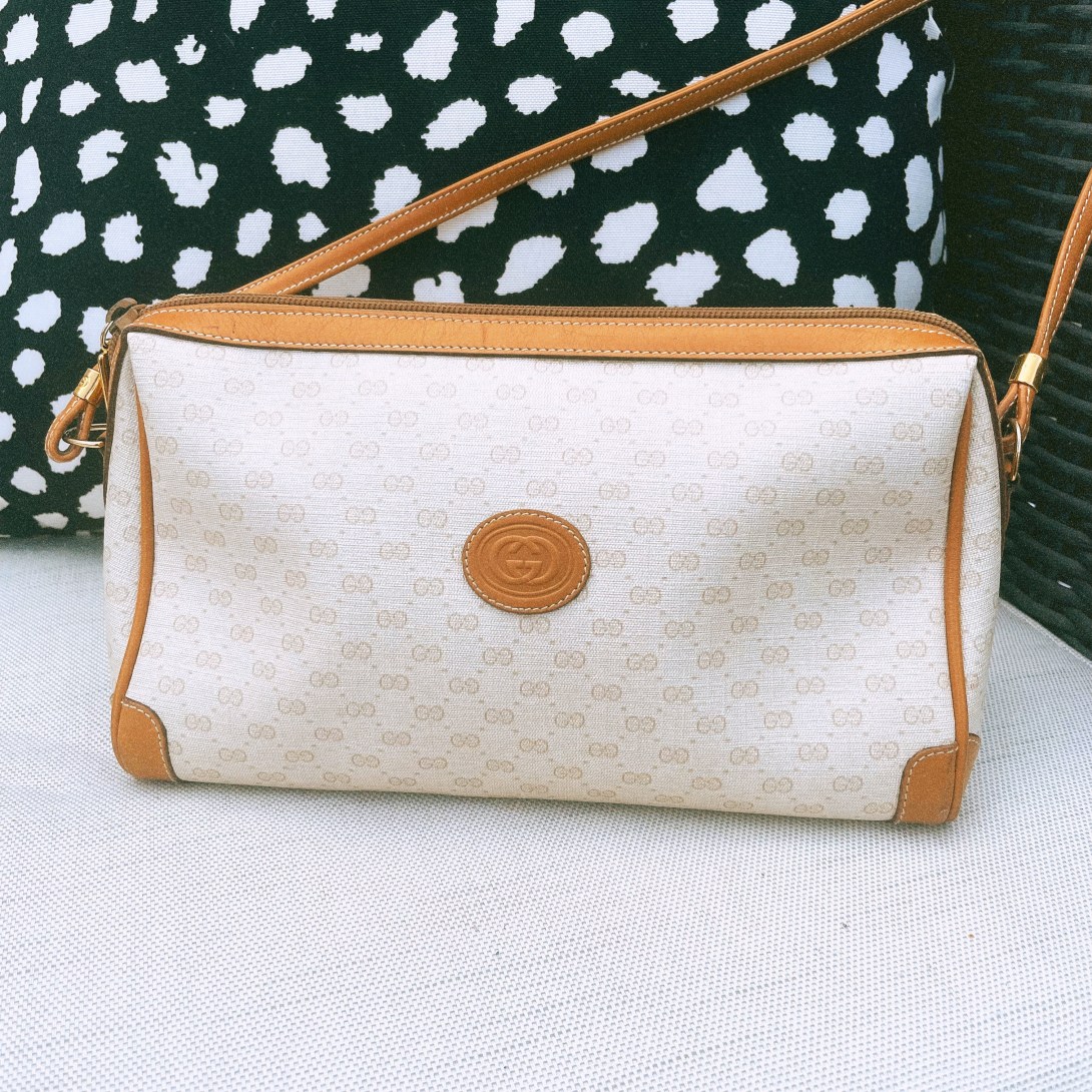 Vintage ivory and tan colored 1980’s Gucci shoulder bag / crossbody in lovely vintage condition with minor flaws as shown in photos. Exterior is constructed of canvas material with leather trim. Interior is a faux suede like fabric.